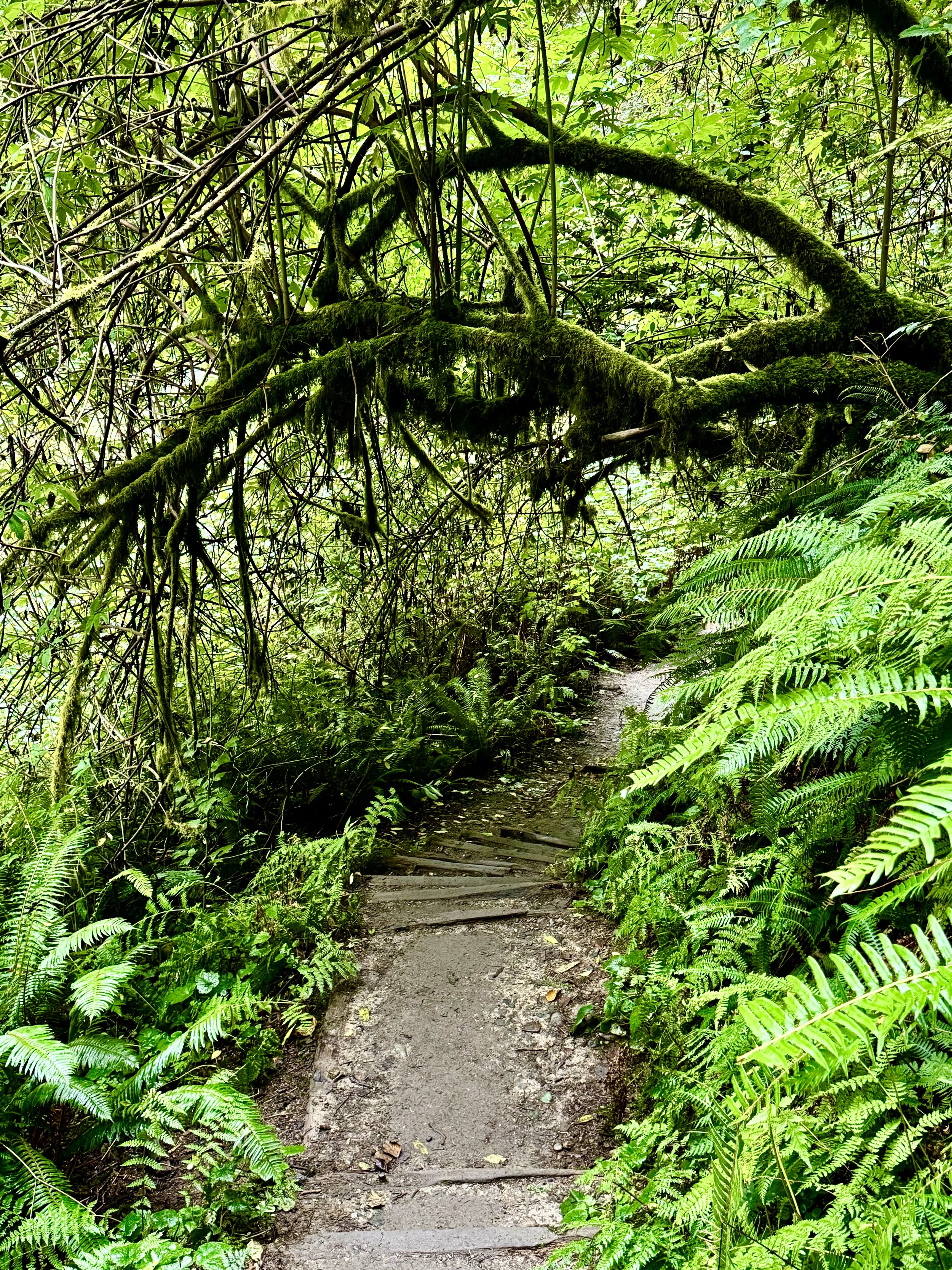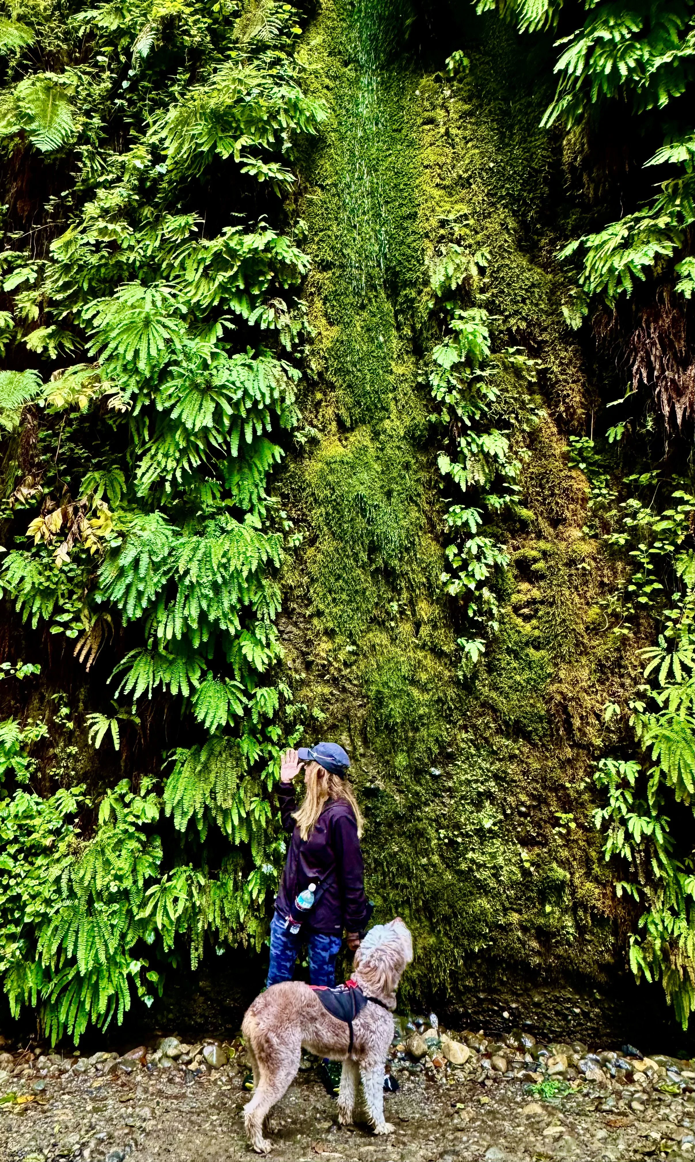 That first evening, we drove into Crescent City and landed at Port O’ Pints Brewing Co. for their legendary Reuben: corned beef marinated in Red Irish beer, melted Swiss, coleslaw, and thousand island on toasted rye. Heaven. I had my heart set on hiking Fern Canyon, that moss-covered, prehistoric gorge where ferns drip from vertical walls like green waterfalls. The next morning we stopped at the Hiouchi Visitor Center, got the latest trail info, and reserved our 9 a.m. entry for Gold Bluffs Beach and Fern Canyon.
