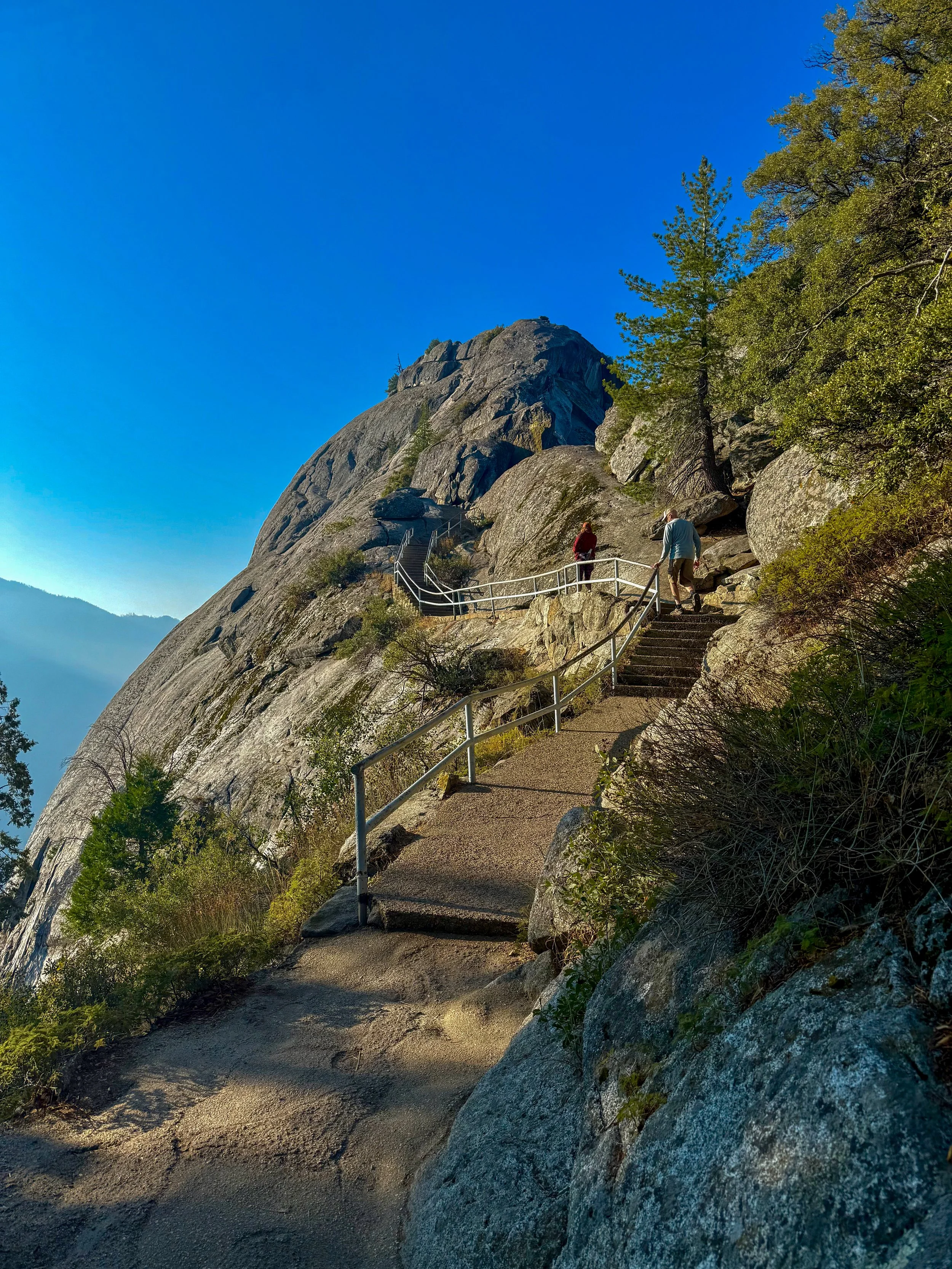 The next morning, we retraced our route up the Generals Highway, the air cooler and the traffic thinner. Wild turkeys strutted across the road like they owned it. By 8am we were standing at the base of Moro Rock, ready to climb. The granite staircase wound skyward, hugging the cliff’s edge in dizzying switchbacks. Every few steps, the view widened—first forest, then ridgeline, then endless layers of Sierra blue. At the top, the wind howled and the world felt infinite.